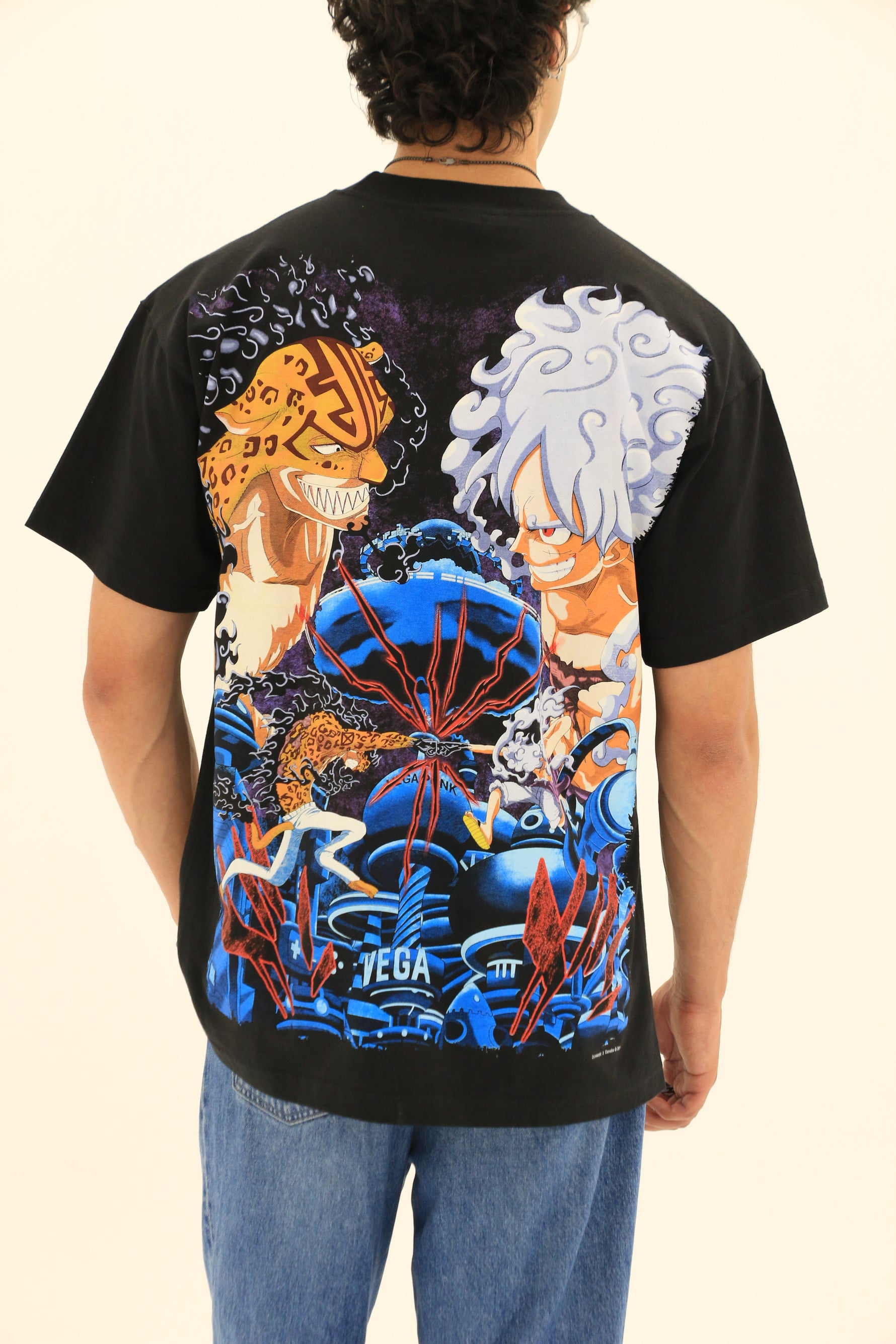 This particular shirt displays Rob Lucci and Luffy from One Piece